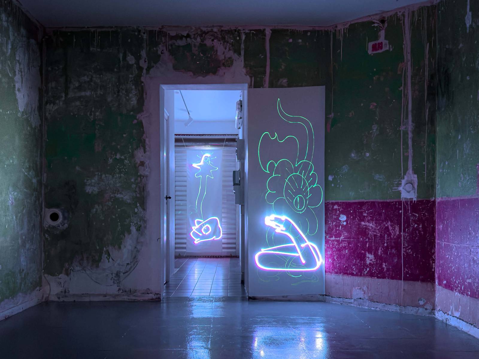 The laser’s bright blasts onto glow-in-the dark fabric creates a space in which the physical and metaphorical realm intersect. The hand-drawn motifs of visceral beings whose mutually erroneous lines entangle on top of each other interlocking them through the glow-in-the-dark fabric’s afterglow: A sort of exquisite corpse-like Rat King, their vitality fades as the fabric discharges.